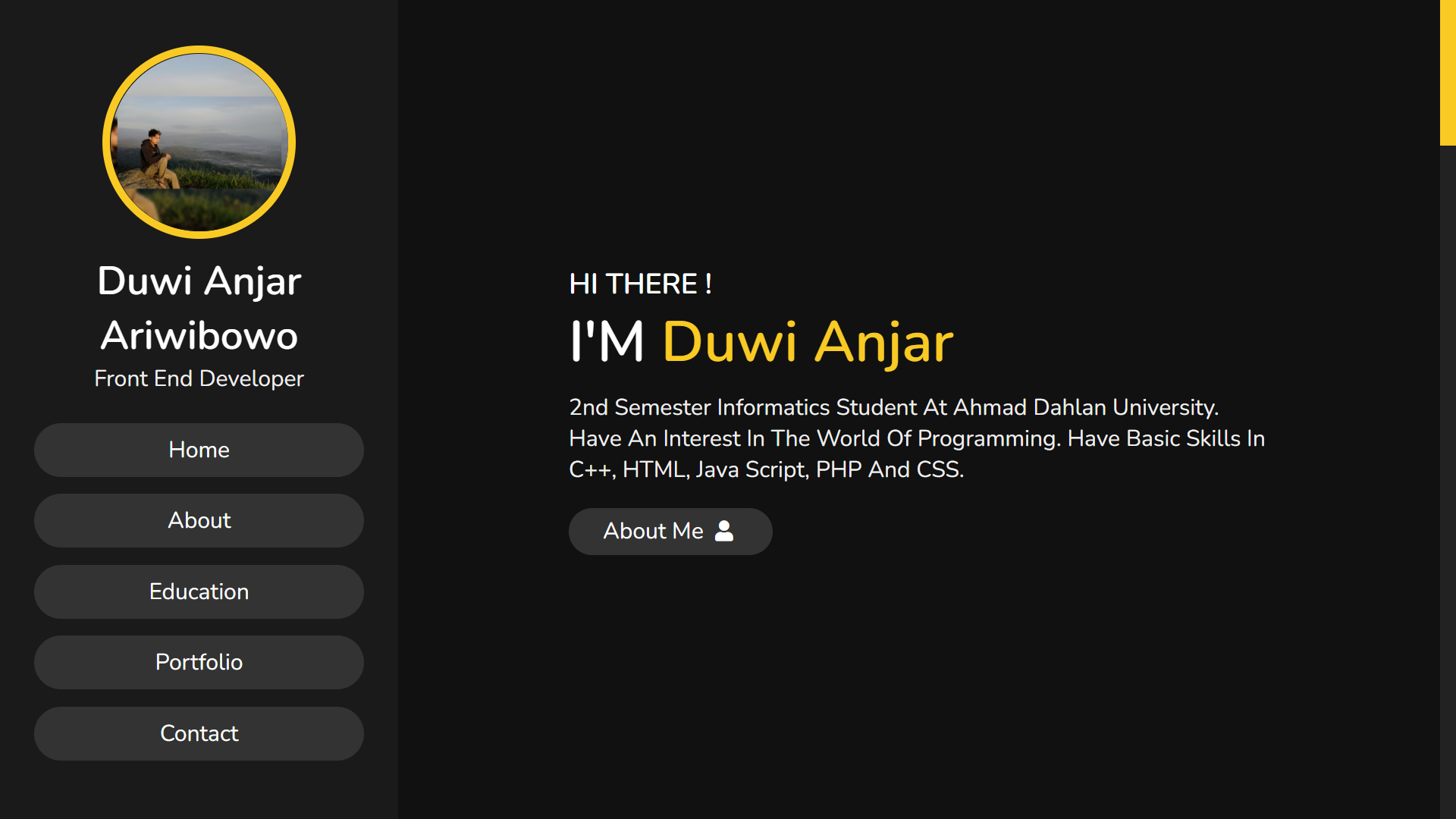 2nd semester Informatics student at Ahmad Dahlan University. Have an interest in the world of programming. Have basic skills in C++, HTML, java script, PHP and CSS.